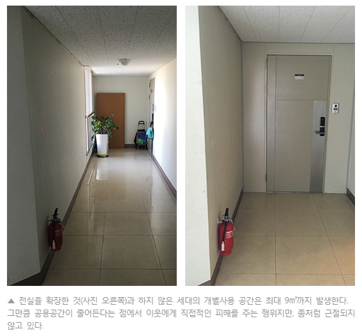 지난해 국토교통부가 발표한 자료에 따르면 2010년부터 발표 시(2015년 8월)까지 전국의 지자체가 적발한 아파트 불법개조 6863건 가운데 전실 확장이 3734건으로 전체의 54%에 달했다. 그만큼 여전히 성행하고 있다는 이야기다.