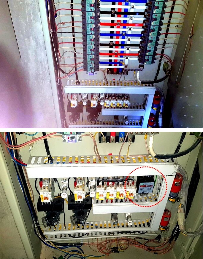 우리 아파트 옥외 CCTV 카메라 및 관련 설비 보호용 SPD를 각동 PM판넬 내에 설치한 사진입니다. 첫번째 사진은 SPD를 부착전, 두번째 사진은 부착 후 사진입니다.