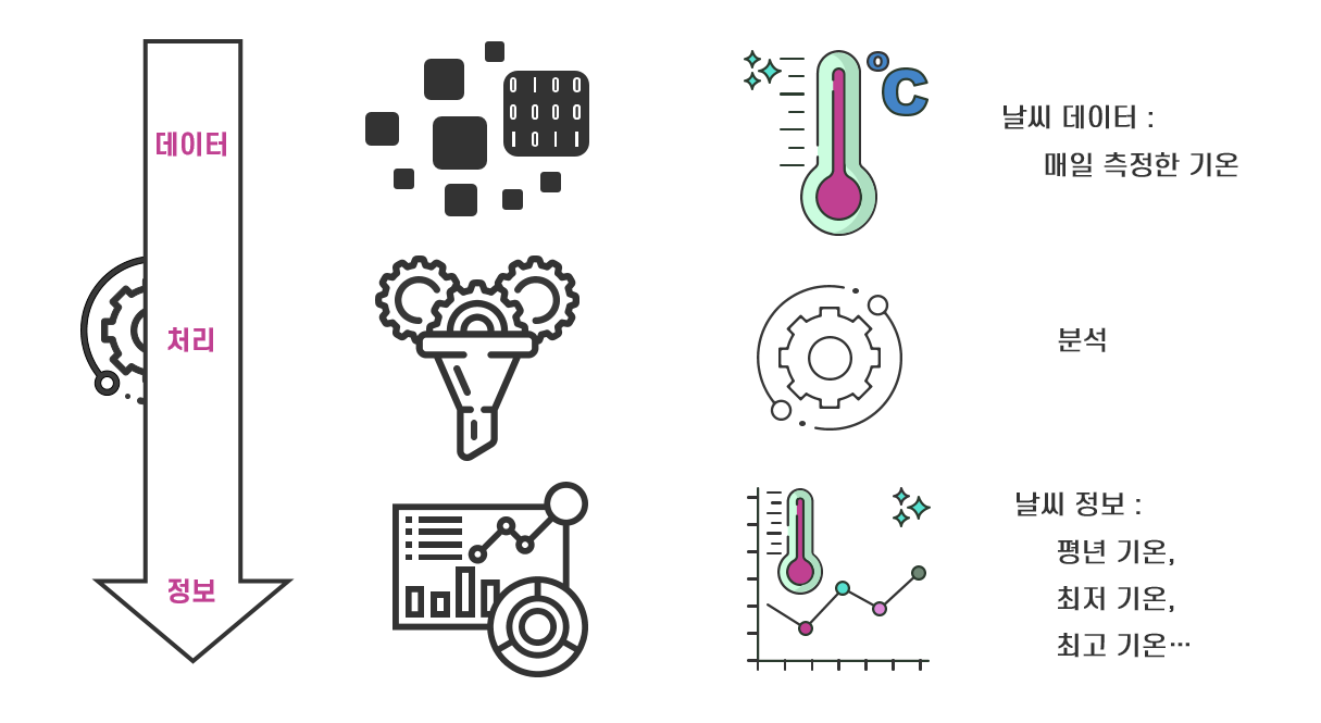 즉, 데이터를 결합하고 분석하여 의미를 부여한 것이 정보입니다. 예를 들어, 매일 측정하여 수집한 기온 데이터를 분석하여 평년기온이라는 정보를 만드는 것입니다.