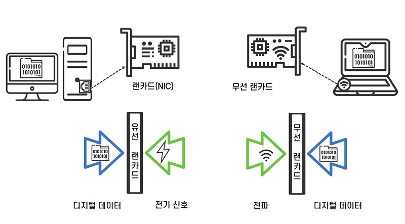 컴퓨터가 만든 디지털 데이터를 랜카드가 전기 신호나 전파로 변환하여 네트워크로 송신하고, 네트워크로부터 수신한 전기신호나 전파를 디지털 데이터로 되돌리기 때문에 네트워크에서 서로 다른 형태의 데이터 전송이 가능해집니다.