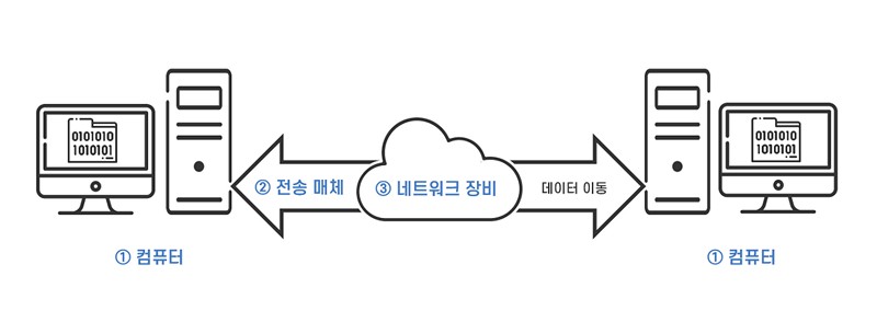 위의 그림과 같이 네트워크에서 ① 두 대 이상의 컴퓨터 (컴퓨터 아이콘), ② 데이터가 이동하는 통로인 전송매체 (화살표 아이콘), ③ 데이터의 이동을 돕는 네트워크 장비 (클라우드 아이콘)가 서로 연결되어 데이터 통신을 합니다.