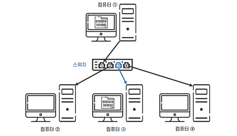 수신하는 데이터의 수신지 컴퓨터를 식별할 수 있는 스위치는 스위치라는 이름처럼 랜포트를 스위치(전환)하면서 데이터의 이동을 컨트롤하여 스위치에 연결된 컴퓨터 중 정확한 수신지 컴퓨터에 데이터를 전송합니다.